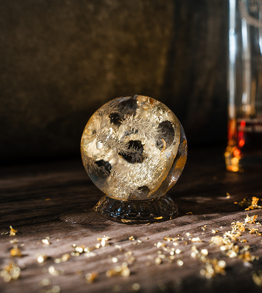 舖入整片食用金箔於冰球正中央,於使用金箔冰球的過程中無限融出金箔,提升冰球獨特性及商品檔次,創造顧客奢華氣派感。